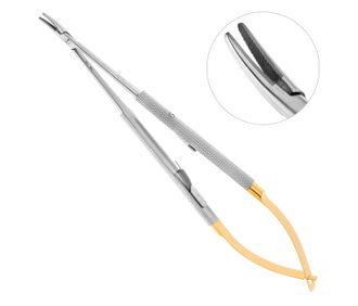 Микрохирургический иглодержатель Castroviejo применяется в основном в стоматологии и микрохирургии. Подпружиненные рукоятки полукруглой формы и кремальера, деликатные прямые рабочие части усиленны твердосплавными вставками.
