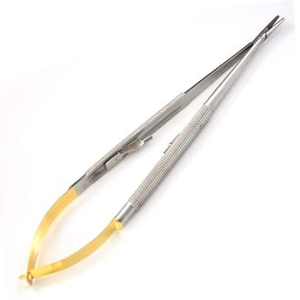 Микрохирургический иглодержатель Castroviejo применяется в основном в стоматологии и микрохирургии. Подпружиненные рукоятки полукруглой формы и кремальера, деликатные прямые рабочие части усиленны твердосплавными вставками.