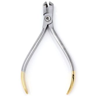 Кусачки дистальные для перекусывания и удержания дуги ТВС предназначены для откусывания дистального участка дуги, удерживая «откусанный» кусочек в рабочей части щипцов. Это позволяет безопасно извлекать отломок из полости рта, предупреждая его попадание в горло. Вы можете приобрести данный инструмент с обычной рабочей частью, удлиненной или старого дизайна. Наличие твердосплавных вставок на рабочей части позволяет использовать их для дуг любого диаметра (до 022×.028). Напыление золотого цвета на рукоятках из нитрида титана придает инструменту дорогой, благородный вид. Твердосплавные вставки на рабочей части из карбида вольфрама увеличивают срок службы инструмента по сравнению с обычными в несколько раз за счет высокой твердости и износостойкости