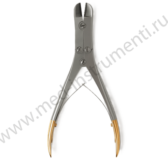 Рабочая часть изогнута под углом в вертикальной плоскости, режущая часть прямая. Режущие части усилены твердосплавными вставками (ТВС). Рукоятки анатомической формы. Кострукция с двойной передачей усилия позволяет эффективно проводить манипуляции с инструментов. Изготовлены из нержавеющей стали.