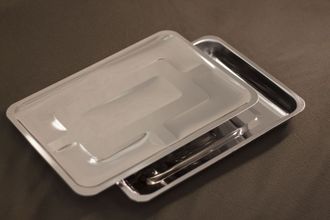 Прямоугольный лоток с крышкой используется в общей медицинской практике, особенно в стоматологии, хирургии, акушерстве и гинекологии. Предназначен для стерилизации медицинских инструментов, их хранения и поддержания стерильности. Медицинский металлический лоток выдерживает неоднократные автоклавирования и обработку дезинфицирующими средствами