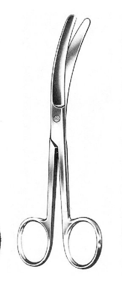 Ножницы для пересечения пуповины горизонтально-изогнутые 160 мм — акушерские ножницы с широкими изогнутыми по ребру рабочими частями. Концы ножниц тупые, чтобы не травмировать ткани.