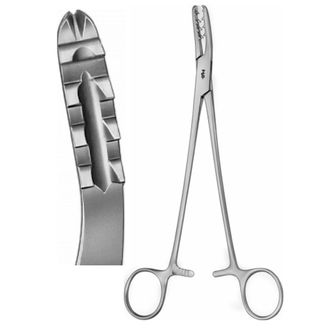 Рабочая часть изогнута по ребру, на браншах по два ряда острых зубов для надёжного захвата и центральная бороздка.