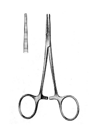 У данного зажима имеет тонкие конусообразные рабочие части, на которые нанесена насечка. Губки прямые, рукоятки кольцеобразные с зубчатой кремальерой (фиксатором).