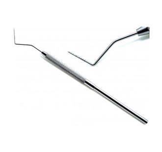 Зонд пародонтологический градуированный шариковый предназначен для проведения обследования зубов: глубина пародонтальных каналов, наличие зубных отложений, оценка корня зуюа и пр. Представляет собой прямую рукоятку с изогнутой рабочей частью с нанесённой на неё разметкой шагом 1,0 мм (длина разметки 15 мм).